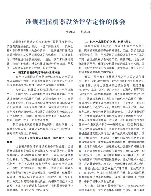 导读:机器设备评估确定价格评估的准确与否是涉及到评估价值真实性的前提。因此,(资产评估准则一机器设备〉中的第三章第十九条中要求“注册资产评估师,财务报表审计应当通过恰当方式获得机器设备整体资产评估的市场信息并对其真实性可靠性进行必要的判断。通过十多年来的评估实践我们不断收集核实机器设备现行价格机制,积累了一些机器设备评估的经验,与同行分享。