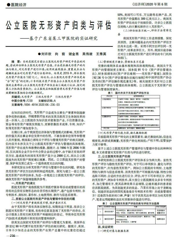 导读:目的是探究目前公立医院无形资产研究中存在的问题,尝试评估样本立医院无形资产总值。方法是依据无形资产的内涵与特点,对无形资产进行归类;运用收益现值法、重置成本法与超额收益法对无形资产进行资产评估。结果是2019年,样本医院无形资产价值为1.82亿元。结论为:公立医院无形资产评估、单项资产评估是由"分"到"总"的过程;非专利技术资产价值占公立医院无形资产价值的主要部分;公立医院无形资产评估应由区域政府认证、指定的第三方机构负责执行;公立医院应积极探索将无形资产价值与绩效薪酬核算相结合的激励模式。