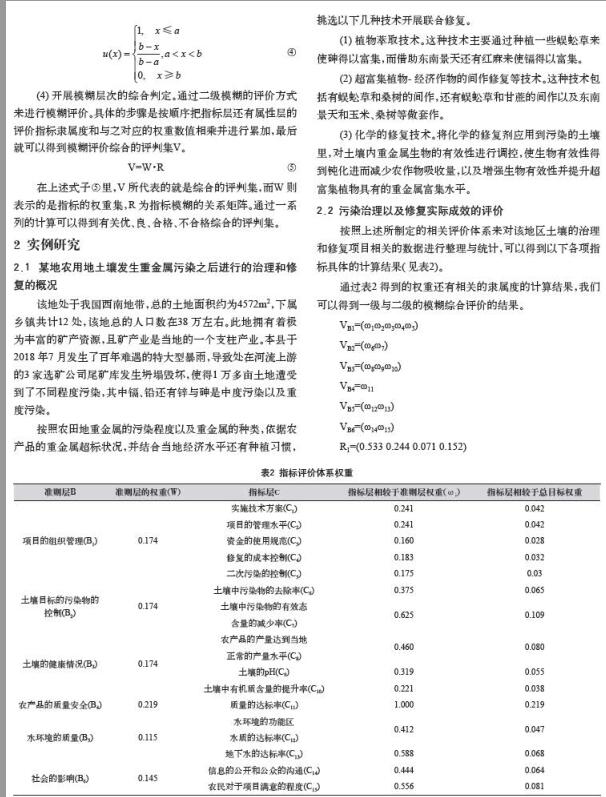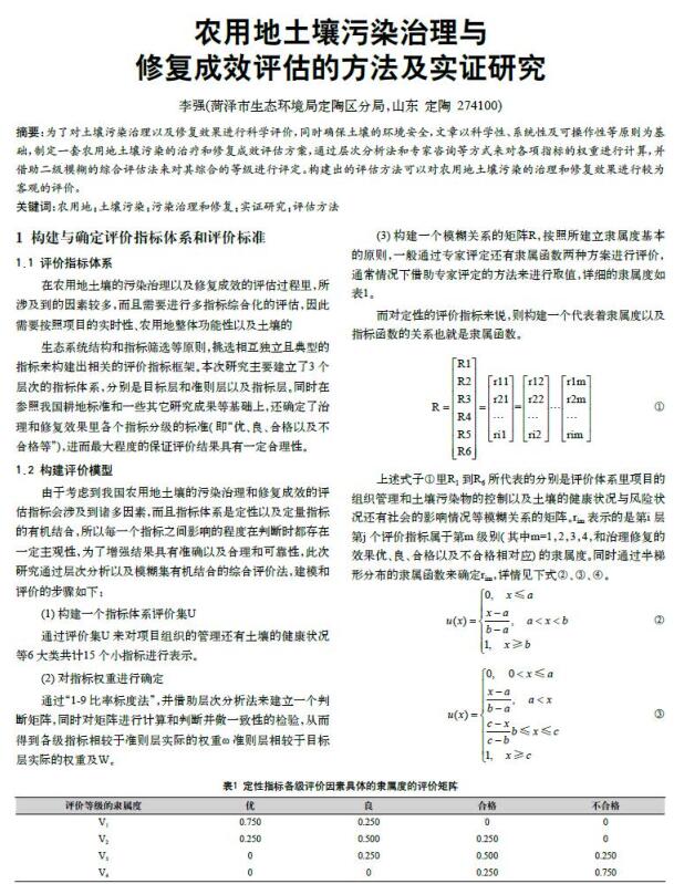 导读:为科学评价土壤污染治理与修复的成效,切实维护土壤环境安全,基于科学性、系统性、可操作性原则的基础上,构建了一套完整的农用地土壤污染治理与修复成效评估的指标体系,运用层次分析法以及专家咨询方式计算各指标权重,采用二级模糊综合评判法资产评估其综合等级,并以广西环江县大环江流域农用地土壤重金属污染治理与修复工程为例进行修复成效综合价值评估.研究所构建的评估方法能够客观评价农用地土壤污染治理与修复成效,为我国受污染农用地土壤治理和修复进行有效管理提供借鉴.