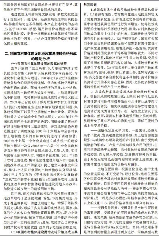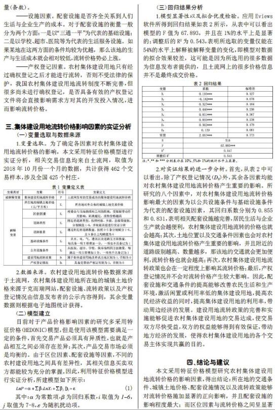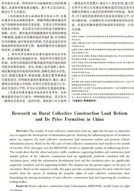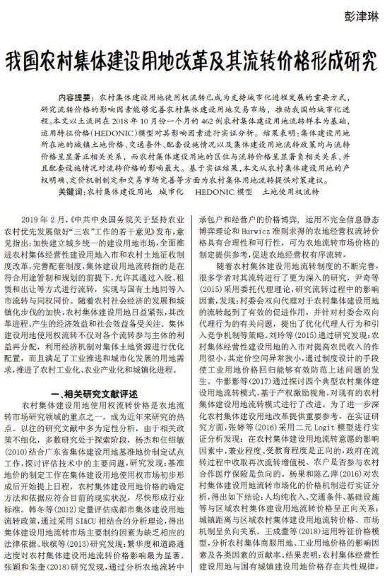 导读:农村集体建设用地使用权流转已成为支持城市化进程发展的重要方式,研究厂房评估公司,房地产评估机构对流转价格评估、抵押评估资产的影响因素能够完善农村集体建设用地交易市场,推动我国的城市化进程。本文以土流网在2018年10月份一个月的462例农村集体建设用地流转样本为基础,运用特征价格(HEDONIC)模型对其影响因素进行实证分析。结果表明:集体建设用地所在地的城镇土地价格、交通条件、配套设施情况以及集体建设用地流转政策均与流转价格呈显著正相关关系,而农村集体建设用地的区位与流转价格呈显著负相关关系,并且配套设施情况对流转价格的影响最大。基于实证结果,本文从农村集体建设用地的产权明确、定价机制制定和交易市场完善等方面为农村集体用地流转提供对策建议。.jpg) .jpg)  .jpg)
