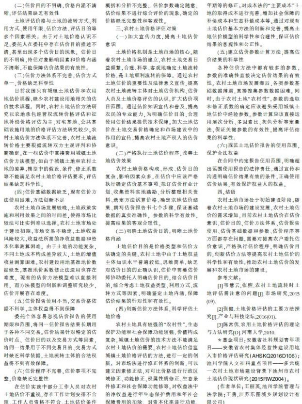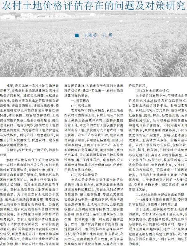 导读::特许经营权价值评估在多元统一农村土地市场建设背景下,分析农村土地市场建设财产价格评估对农村土地估价的要求。通过实地调查、文献统计的方法,分析当前农村土地价格评估农产品评估在评估委托、评估目的确定、评估方法选择、修正系数确定以及评估报告使用中存在的问题,结合我国土地管理法律法规、土地估价规程和其他土地估价相关理论价格鉴证,提出改良农村土地估价现状,推动农村土地估价发展的对策。专业评估公司为完善农村土地估价资产价格评估理论与方法体系,制定农村土地管理政策,调整估价企业发展模式,促进农村土地市场健康发展提供参考。