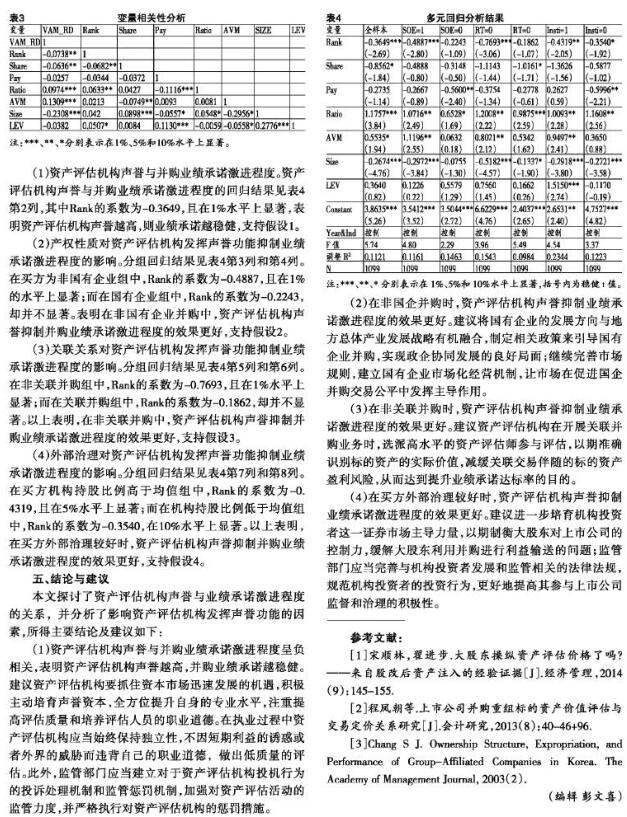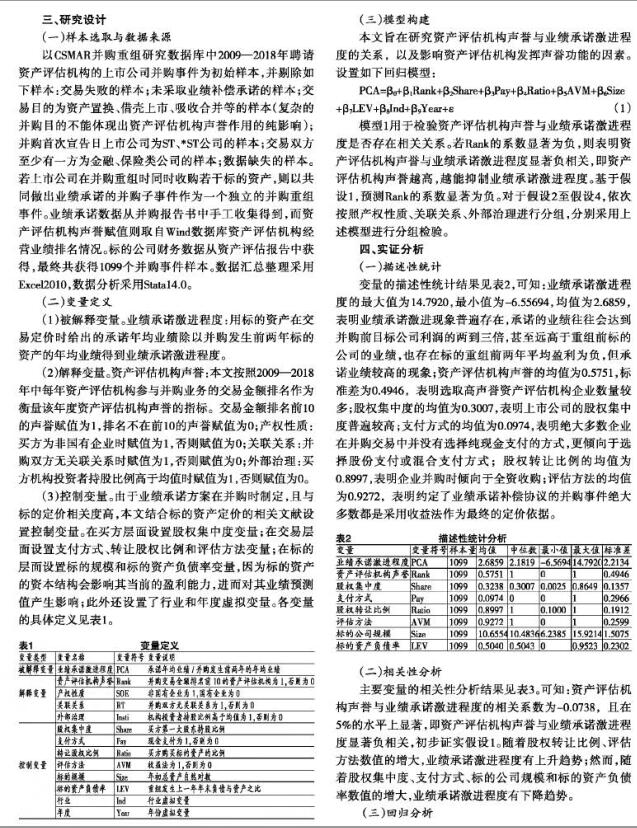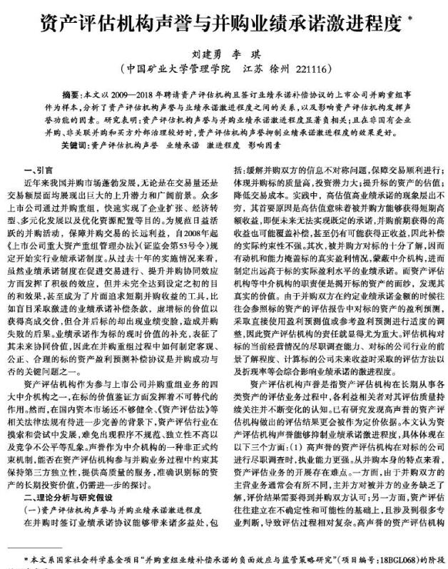导读:本文以2009—2018年聘请资产评估单位、资产评估机构且签订业绩承诺补偿协议的上市公司并购重组事件为样本,分析了资产评估机构声誉与业绩承诺激进程度之间的关系,企业整体资产价值评估以及影响资产评估机构发挥声誉功能的因素。研究表明:公司资产评估公司资产评估机构声誉与并购业绩承诺激进程度显著负相关;且在非国有企业并购、非关联并购和买方外部治理较好时,企业评估机构资产评估机构声誉抑制业绩承诺激进程度的效果更好。