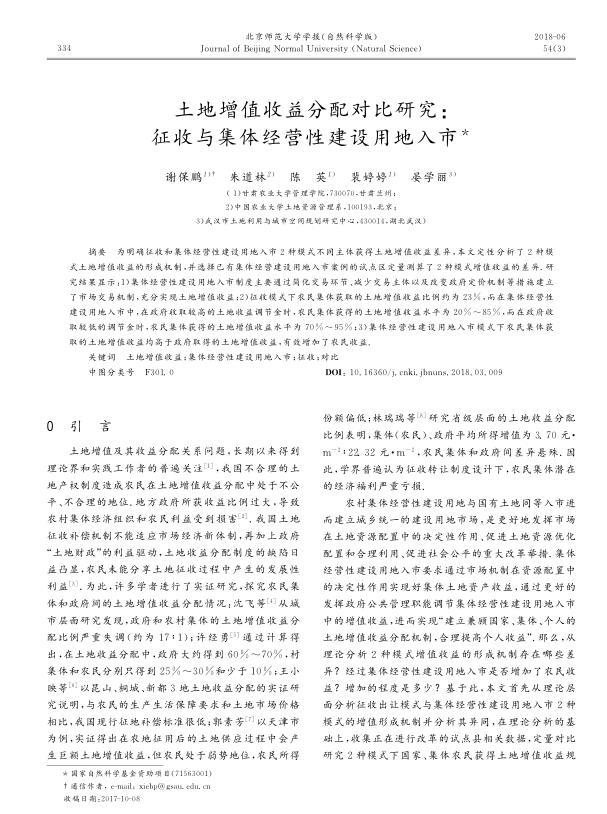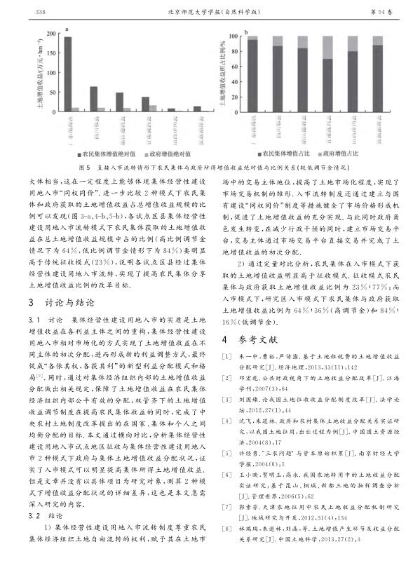 导读:除专利技术资产评估外的非专利技术评估涉及的为明确征收和集体经营性建设用地入市2种模式不同主体获得土地评估土地增值收益差异,本文定性分析了2种模式土地增值收益的形成机制,并选择已有集体经营建设用地入市案例的试点区定量测算了2种模式增值收益的差异.研究结果显示:1)集体经营性建设用地入市制度主要通过简化交易环节、减少交易主体以及改变政府定价机制等措施建立了市场交易机制,充分实现土地增值收益;2)征收模式下农民集体获取的土地增值收益比例约为23%,而在集体经营性建设用地入市中,在政府收取较高的土地收益调节金时,农民集体获得的土  地增值收益水平为20%~85%,而在政府收取较低的调节金时,农民集体获得的土地增值收益水平为70%~95%;3)集体经营性建设用地入市模式下农民集体获取的土地增值收益均高于政府取得的土地增值收益,有效增加了农民收益.