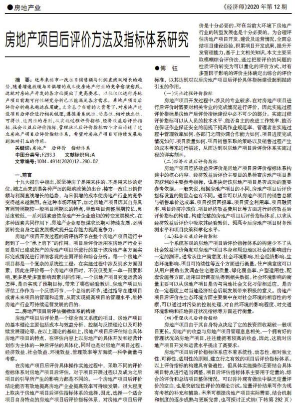 导读:近年来楼市一改往日销售额与利润直线双增长的趋势,随着增速放缓与日俱增的成本使房地产行业的竞争愈演愈烈。房地产评估、土地评估这就对房地产开发的各方面提出了更高要求,以往仅仅进行房地产项目前期可行性研究分析已不能满足各方需求,房地产项目后评价分析越来越迫在眉睫。公司资产评估公司基于当前的大背景下,对房地产建设项目后评价进行相关梳理,遵循着系统性、动态性、相对独立性、可得性、适用性的原则,从实施过程评价指标、经济效益后评价指标、社会效益后评价指标、管理状况后评价指标四个方面论述了建立房地产项目后评价指标体系,房屋估价希望对房地产项目可持续发展起到抛砖引玉的作用。