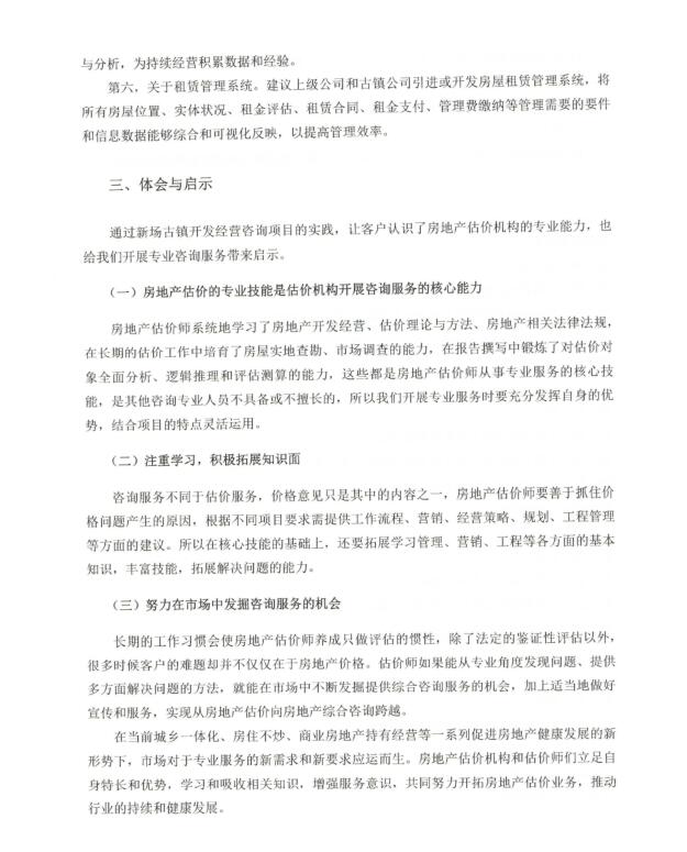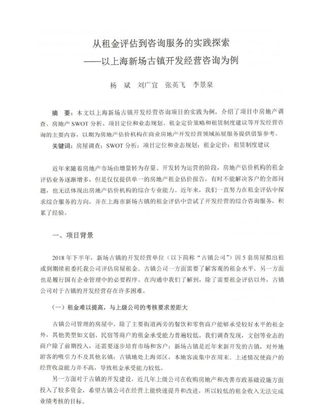 导读:近年来随着房地产市场由增量转为存量、开发转为运营的阶段,房地产估价机构的租金评估、房屋租金评估业务逐渐增多,但是仅仅提供单一的房地产租金估价报告,有时不能解决客户的全部问题,也无法体现出资产评估公司网站房地产估价机构的综合专业能力。资产评估哪里好近年来,我们一直努力在租金评估中探求综合服务的方向,并在上海市新场古镇的租金评估中尝试了开发经营的综合咨询服务,积累了经验。