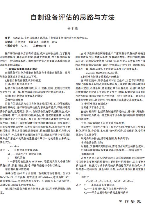 导读:资产评估的准确性,减少评估失实,资产评估公司,整体资产评估公司提高工作效率,设备评估在自制机器设备评估中一般采用成本法,设备评估公司即用被评估资产的重置成本乘以综合成新率来加以确定。一、自制设备重置成本的确定自制设备可以分为标准自制设备和非标准自制设备,这两种设备重置成本的确定方法不同。
