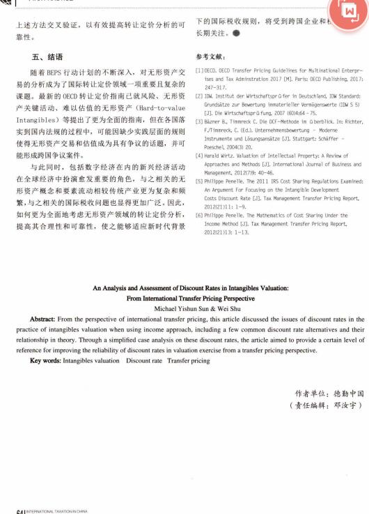 导读:在以第三产业为主导的发达经济体中,无形资产 占据了技术评估价值创造的重要地位。随着我国进一步深化供 给侧结构性改革和促进产业链升级,无形资产也不断 成为高增长高潜力行业和智慧型经济中的重要价值组 成部分。专利评估公司,从国际转让定价角度出发,本文探讨了无形资产估值无形资产评估实践中运用收入法时的折现率问题专  利权评估,包括常 见的几个折现率及其之间的版权评估理论联系,通过案例分析常见折现率之间应有的关系为就提高转让定价角度估值分析 的可靠性提供一定的参考。
