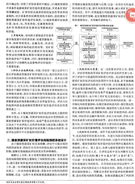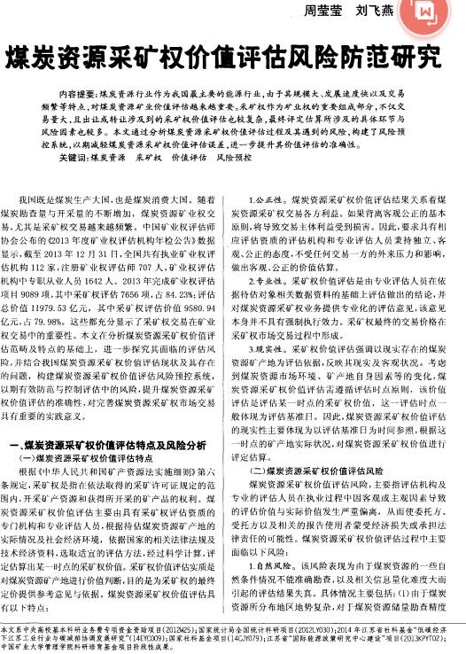 导读 :采矿权作为矿业权的重要组成部分,上海资产评估不仅交 易量大,且出让或转让涉及到的自然资源评估,特许经营权评估也较复杂,整体资产评估机构最终自然资源评估评定估算所涉及的具体环节与 风险因素也较多。本文通过分析煤炭资源采矿权价值评估过程及其遇到的风险,构建了风险预 控系统,以期减轻煤炭资源采矿权价值评估误差,进一步提升其价值评估的准确性。 煤炭资源行业作为我国最主要的能源行业,由于其规模大、发展速度快以及交易 频繁等特点,对煤炭采矿权评估,探矿权评估越来越重要。.jpg) .jpg) .jpg)