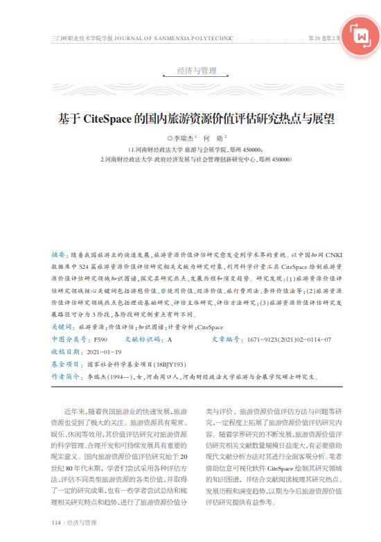导读:评估事务所研究发现:(1)旅游资源价值评估研究领域核心关键词包括游憩价值、非使用价值、经济价值、旅行费用法、条件价值法等;(2)价格评估旅游资源价值评估研究领域热点包括理论基础研究、评估主体研究、评估方法研究;(3)旅游资源价值评估研究发展路径可分为3阶段,各阶段研究侧重点有所不同。资产评估随着我国旅游业的快速发展,资产评估公司旅游资源价值评估研究愈发受到学术界的重视。上海评估公司以中国知网CNKI数据库中524篇旅游资源价值评估研究相关文献为研究对象,评估机构利用科学计量工具CiteSpace绘制旅游资源价值评估研究领域知识图谱,资产评估机构探究其研究热点、发展历程和演变趋势。
