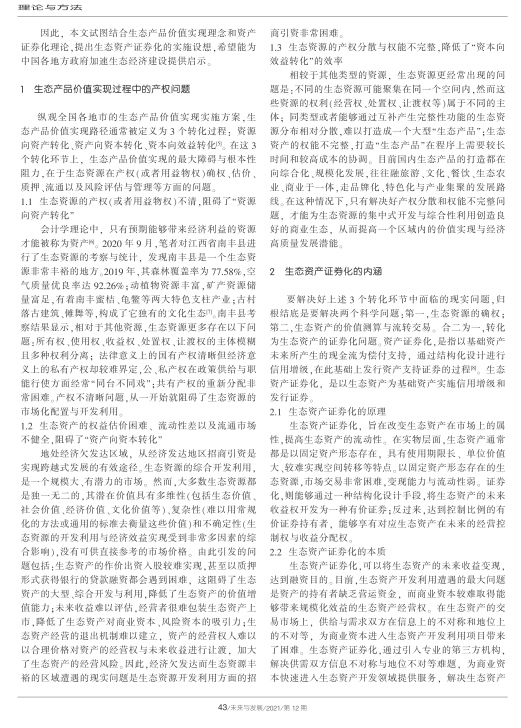导读:生态产品价值实现是中国现阶段的重要战略举措。资产评估,资产评估公司,无形资产评估通过分析生态产品价值实现机制中的产权问题,明确生态资产证券化是其关键点。 进而,从原理、本质、目标三方面阐述生态资产证券化的内涵,并以 4 个实例概括中国在生态资产证券化方面的经验与问题, 由此提出生态资产证券化的机制与策略。 最后,概述实施生态资产证券化的潜在风险。生态产品价值实现是中国政府提出的一项创新性的战略举措和任务。生态产品价值实现,需要以特色生态产品和产业为中心,以项目制整合区域内生态资源,引入金融与社会资本并进行公司化运作, 专利评估,评估公司,房地产评估,房地产评估公司整体盘活要素市场与产品市场, 提高生态资源利用效率和生态产品价值增值能力。在生态产品价值实现的路径中,最基础也是最困难的问题在于生态资源的确权与流转,因此,生态资产证券化将是各地方政府未来在生态资产价值实现中需要解决的共性问题。本文系统探究了生态资产证券化的理论、实践与策略,也指出了生态资产证券化的潜在风险,希望能够为各地方政府建设生态资产证券市场和加速生态产品价值实现提供参考。